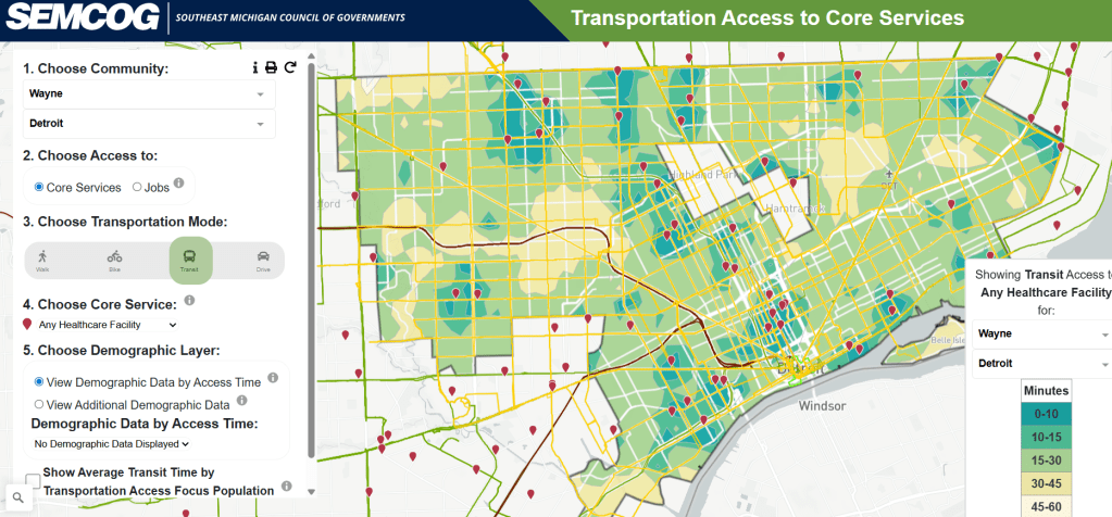 SEMCOG has released their updated analysis of transportation access to core services. The first study came out in 2015, so this is a timely update. I specifically shared the map of transit access to “any healthcare facility” because I think it accentuates the difficulties we have with both healthcare access and transit connectivity.