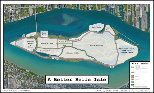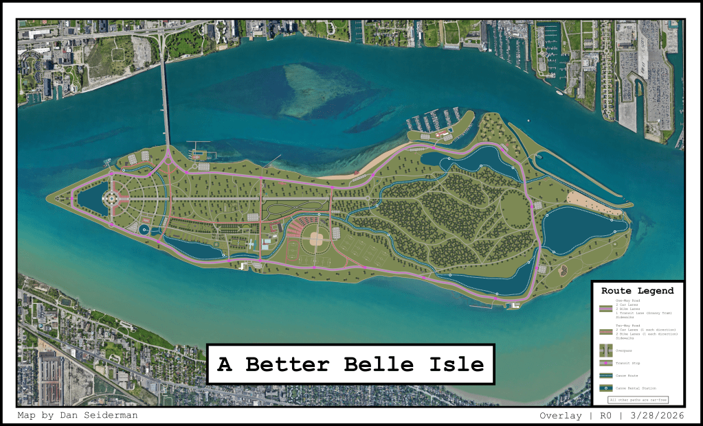 These recommendations are meant to create a flowing park experience that feels more cohesive and more walkable than the current layout. I like a lot of the work that has been done over the past couple of years between the mobility study and the Belle Isle Commons projects, but I wanted to share my own vision as I believe it presents a strong, high-level perspective.
