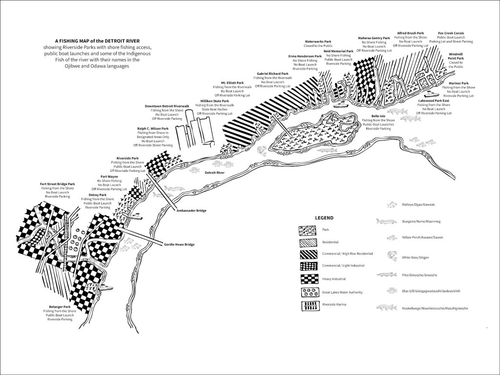 I created this map as part of a project with Friends of the Rouge and the University of Michigan Detroit Center to share the importance of shore fishing to the Boynton, Delray and Oakwood Heights communities around Fort Street Bridge Park and Zug Island.