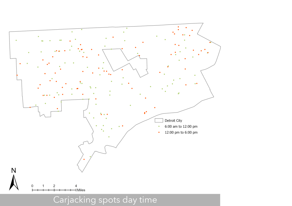 Detroit’s downtown and midtown are safer during the day especially between 6 am to 12 pm. Between 321 carjacking incidents that had happened during daytime, 51% happened between 6 am to 12 pm and 49% happened between 12 pm to 6 pm.