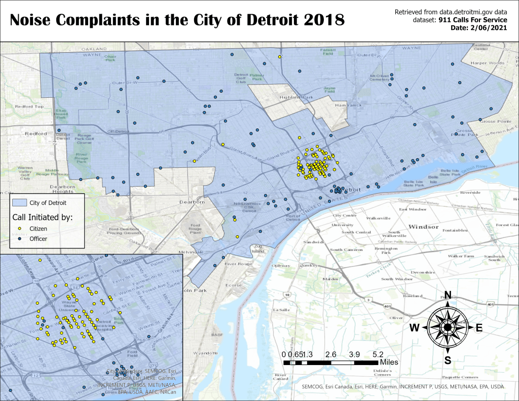 I pulled the dataset from the the city of Detroit open data portal. The dataset includes all 911 police emergency response and officer-initiated calls for service in the City of Detroit since September 20, 2016. I used Rstudio and the Tidyverse library to clean the data. The exact code and steps for cleaning can be seen here. Once the entire dataset was cleaned, I took all observations which were Noise Complaints and mapped them in ArcGIS Pro by matching up the Lat/Long columns as XY columns. In order to map the officer initiated variable it was a simple matter of opening up the symbology and choosing to symbolize by category.