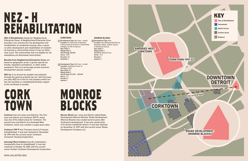 The dataset chosen was from the NEZ-H Rehabilitation and Homestead, specifically zones from Corktown and Monroe Blocks. Most younger people are not aware as to what neighborhood enterprise zones are in Michigan. This map is to educate the younger audience and anyone else who does not know what these zones are for. I compared an slightly older zone, old zone, and a zone more recent. I provided information from the City of Detroit Open Data Portal in the boundaries section of datasets. The illustrations are created by me with a help of the maps via Google. The colors are used to give a neutral setting with some pop of color depending on the importance of the map. The elements in my visual is to indicate any information provided about the tax property, borders, and more.
