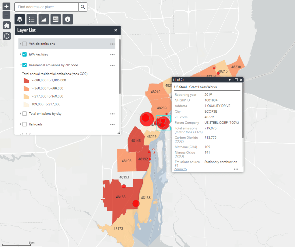 This map was created by the Detroit River Story Lab at the University of Michigan, Ann Arbor. Our goal is to estimate the total amount of greenhouse gas emissions (i.e., create an emissions inventory) for the Detroit River Corridor. We created this online, interactive map as an accessible tool for anyone interested in understanding carbon emissions at a local level. We are currently working with local educators in Detroit-area schools to include the use of this tool in school curricula.