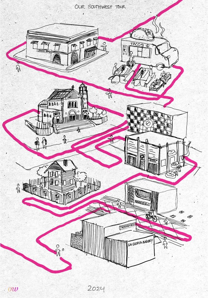 ‘Our Southwest Tour’ map was initially created to explore new forms of graphic representation, but quickly turned into a piece that we incorporated into one of our current Southwest Detroit projects, a boba tea shop. As we began the process, we wanted to be intentional about how we blended the history of boba tea into the history of Southwest. In order to enrich our research and gather information to use in future projects, we spent a day on what we call, “Our Southwest Tour.”