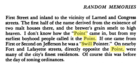 However, one “Swill Pointer,” John C. Lodge, couldn’t recall why it was every called “the Point” as there was no physical point anywhere around the neighborhood area. Writing in 1949, Lodge noted that very few Detroiters at that time had probably ever heard the name Swill Point.
