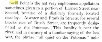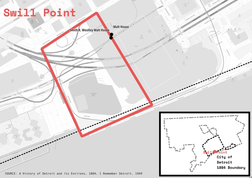 The physical area where Swill Point was no longer exists as it did in the 1880s. The area was named for the the malt houses where grain malt was soaked for beer or whiskey brewing. The smell from the “swill” of soaking malt grains is very strong and clearly made a notable geographic place in early Detroit.