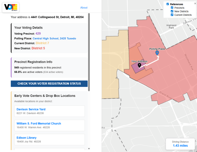 Knowing where to vote and how to get there should be the easy parts of voting. Democracy depends on engagement and Detroit has relatively low levels overall from the loss of city services, emergency management, and general apathy towards local government. We’ve built a tool that helps anyone work through their voting options based on their address: VoteDetroit.org